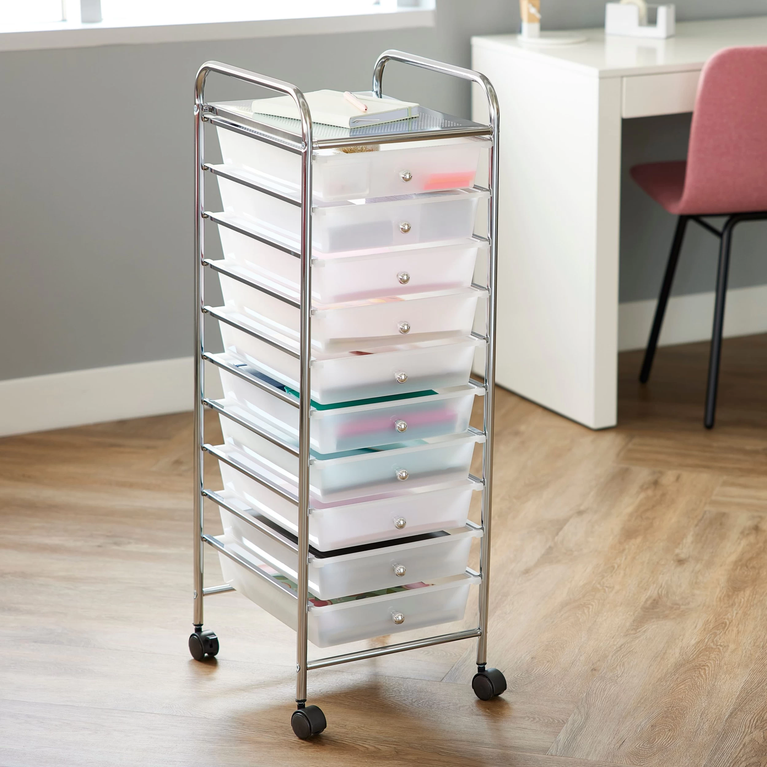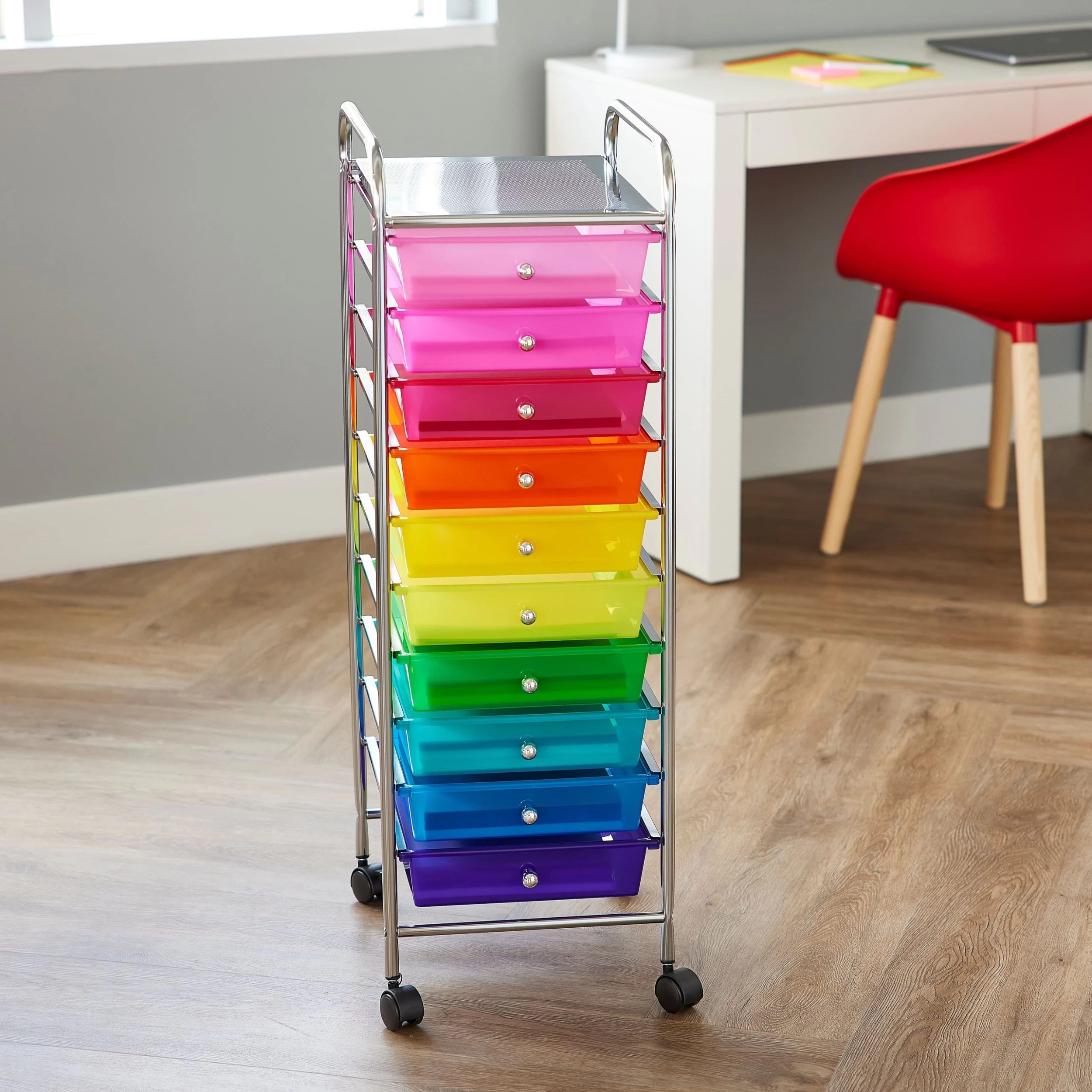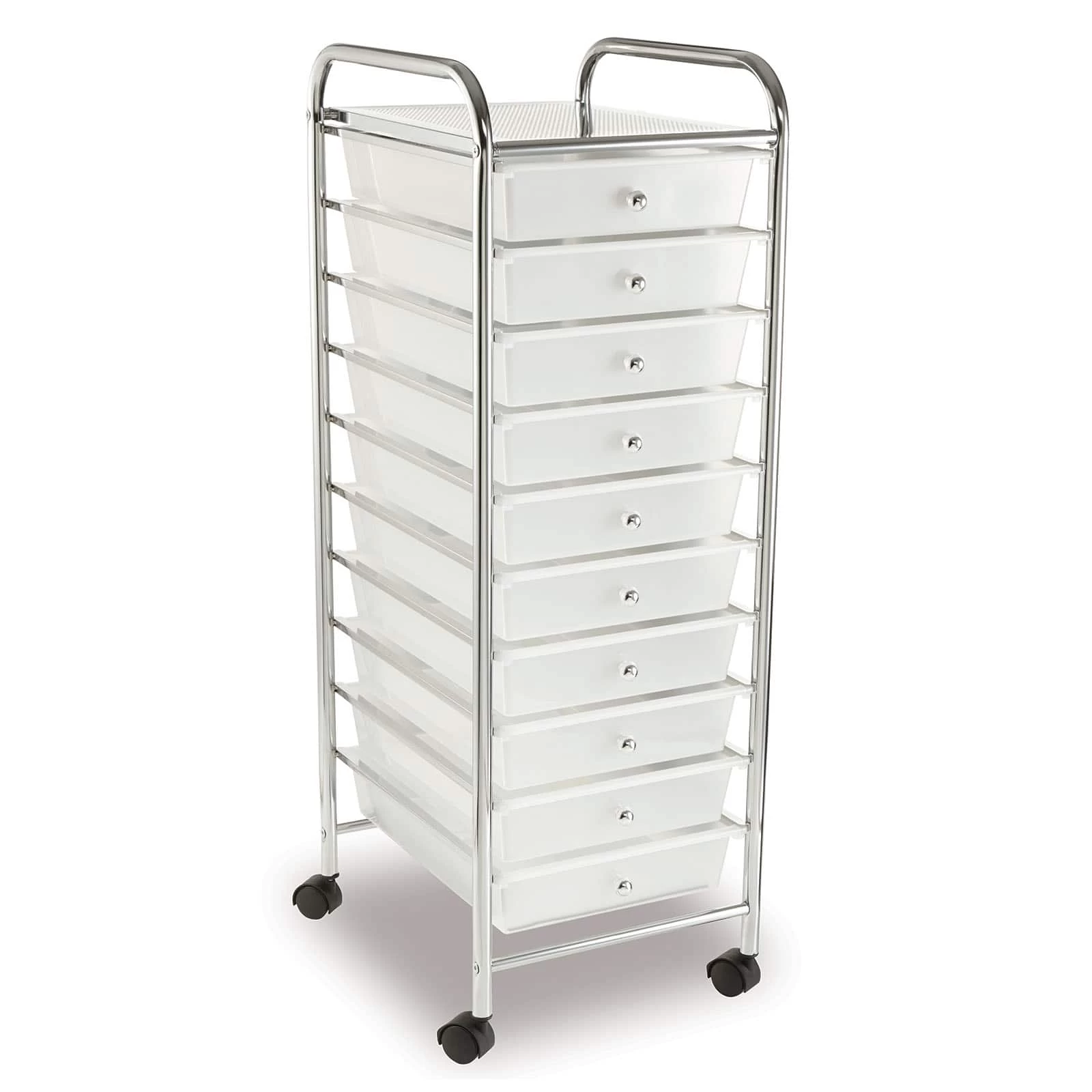Empower your storytelling with everything at your fingertips. Whether it is kids’ supplies or your scrapbook materials, this 10-drawer cart will keep your crafting area organized. Drawers remove easily to take with you to your project area. This cart is mounted on four swivel casters, which makes moving the entire cart from room to room easy.