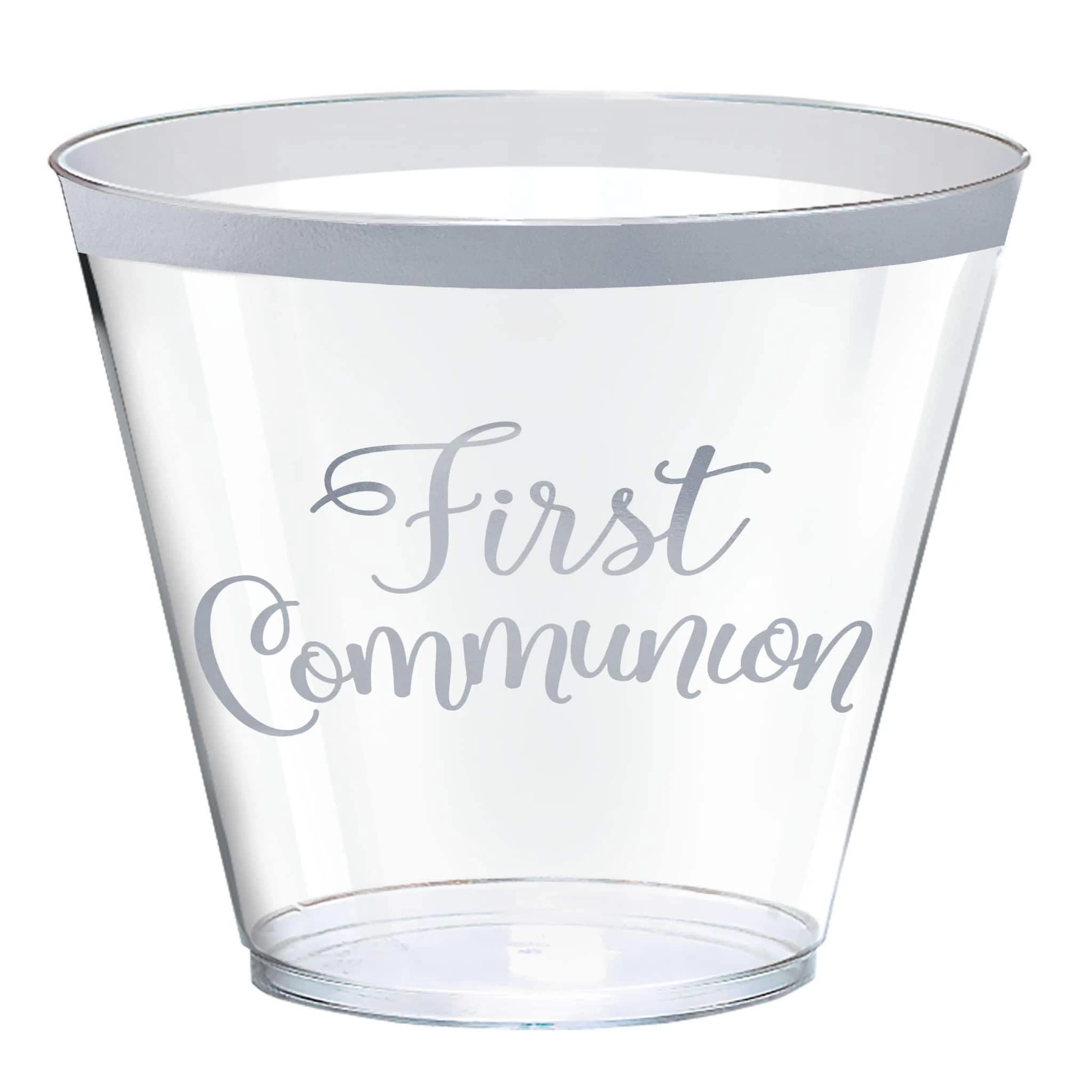 Celebrate the guest of honor with these Metallic Silver First Communion 9 oz. Plastic Cups. Each cup features a metallic silver rim and a matching “First Communion” message.