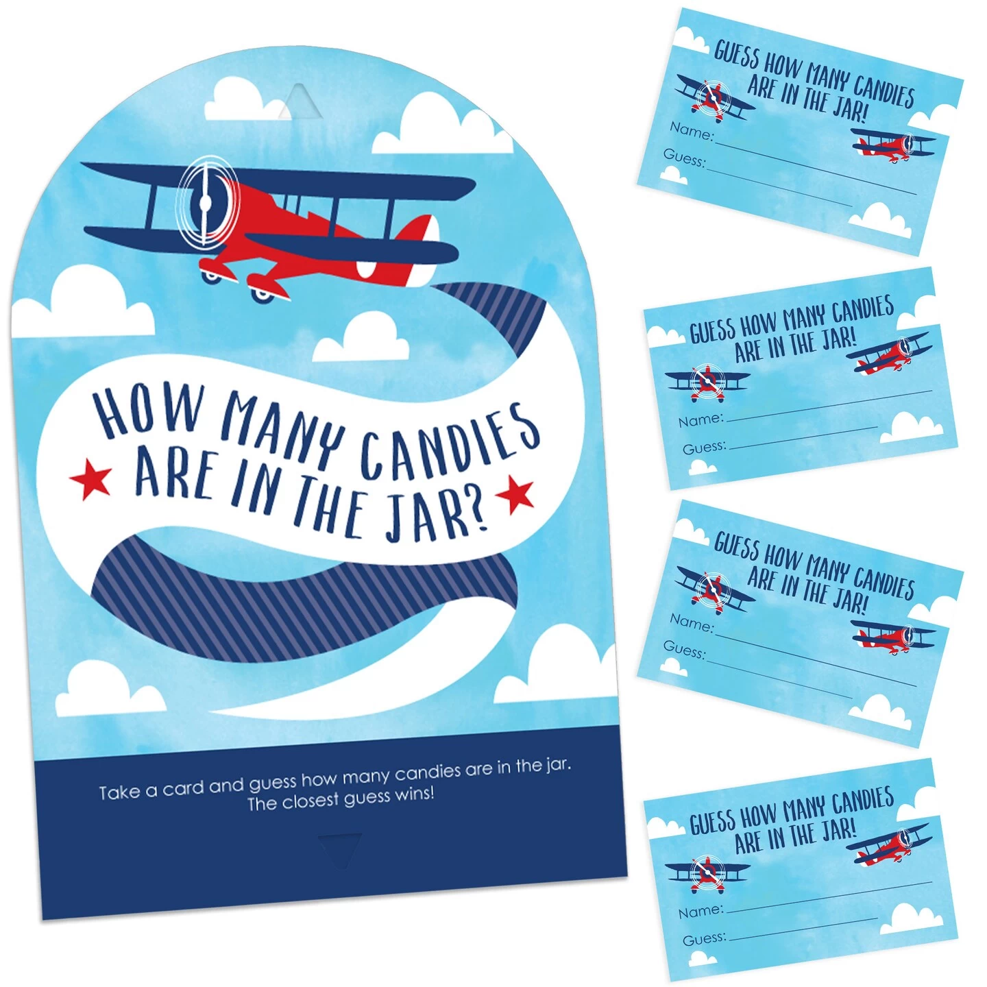 Taking Flight – Airplane Candy Guessing Game INCLUDES 1 sign with a built-in stand and 40 guessing cards that will look great at your Birthday Party or Baby Shower. Sign measures 7.5” wide by 11” tall and cards measure 3.5” by 2.25” tall. Candy and jar are not included. HOW TO PLAY: Draw attention to your candy jar with the Taking Flight – Airplane Candy Guessing Game! Place the sign and cards next to your candy jar. Guests can then take a card and guess how many candies are in the jar. The closest guess wins! EASY ASSEMBLY: To use, fold the sides of the stand towards the center. Then, fold down the support piece of the stand until it rests in the notches. Finally, display your Vintage Plane sign next to your container of candy. HIGH-QUALITY SUPPLY: Taking Flight – Airplane Candy Guessing Game is professionally printed double-sided on sturdy cardstock paper with a photo-like shine. They are individually inspected and then carefully packaged by hand. Sign arrives flat with some easy assembly required. MADE IN THE USA: Taking Flight – Airplane Candy Guessing Game is designed and manufactured at our Wisconsin facility using materials that are Made in the USA.