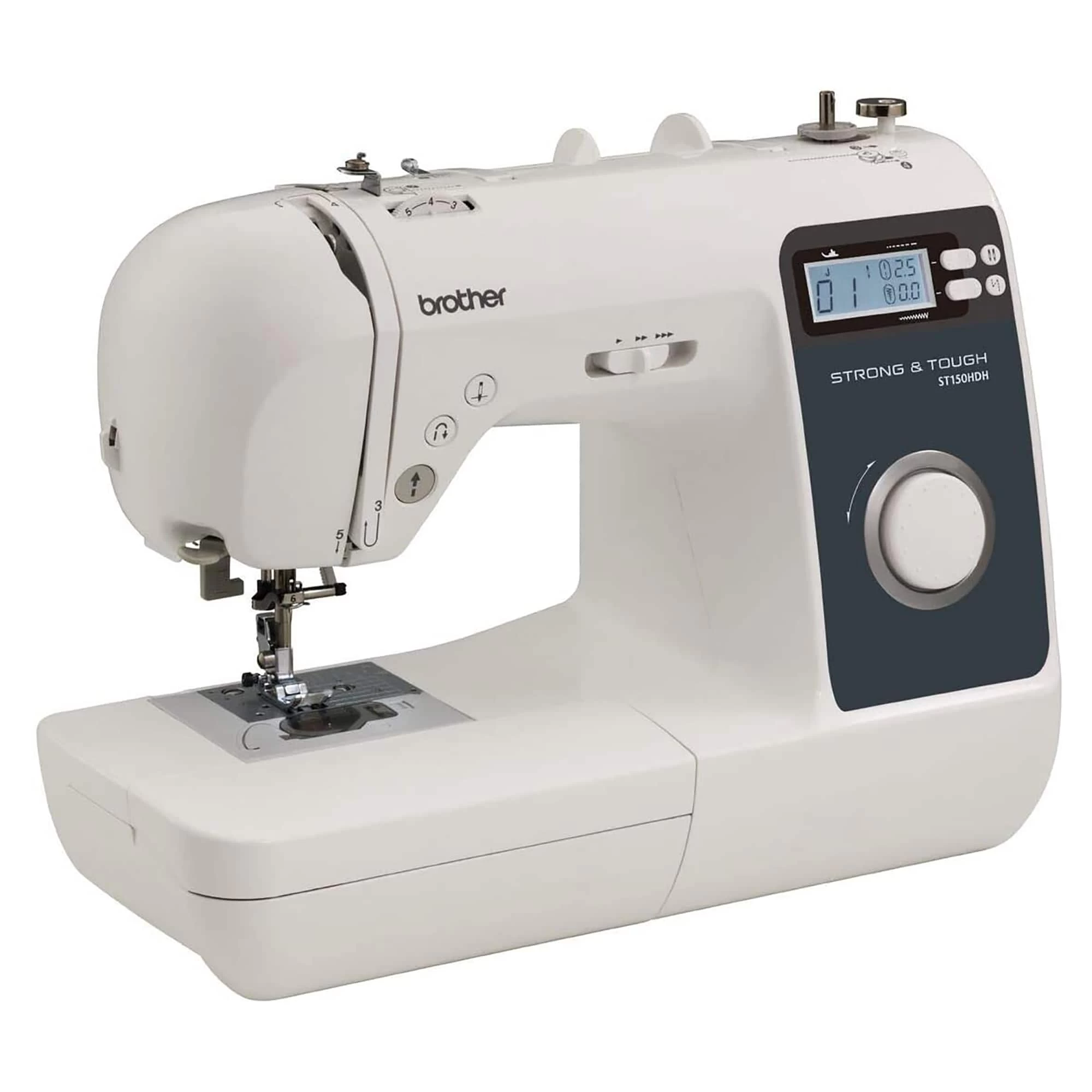 Sew on everything from multiple layers of heavyweight fabrics and denim to lightweight silks. Select and view one of the 50 built-in sewing stitches, including 5 styles of one-step, auto-sized buttonholes on the large back-lit LCD display. Featuring longer 7-point feed dogs with box feed design to help provide smoother fabric feeding even with tough projects. The right and left feed dogs grab your fabric securely while the center feed dog holds the thread, for superior stitching and feeding. The included needles consist of two #14 heavy duty needles for sewing heavier fabrics such as jeans and leather, in addition to two #11 needles for light to medium weight fabrics and two #14 ballpoint needles for knits and other stretch fabrics.The ST150HD is sure to bring the power of Brother Strong & Tough sewing to your craft room!