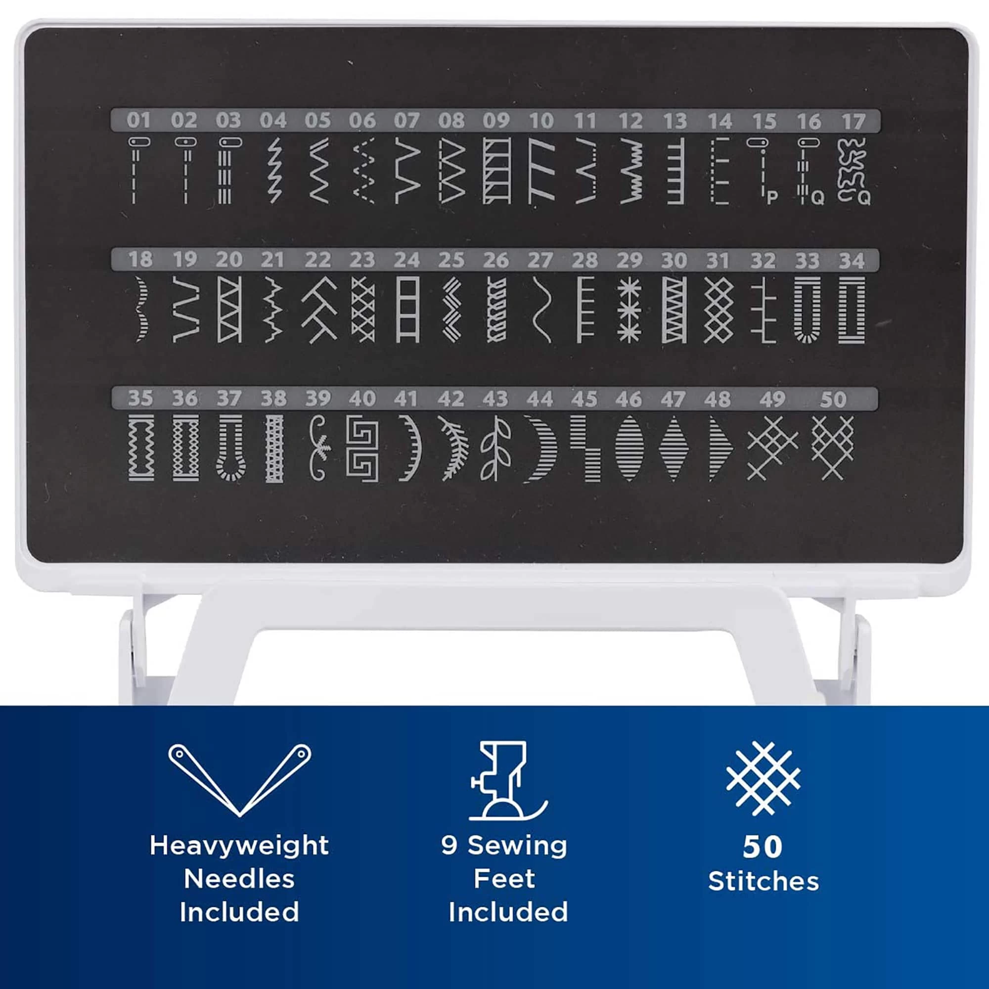 - 50 built-in sewing stitches (including decorative stitches and 5 styles of one-step, auto-sized buttonholes)