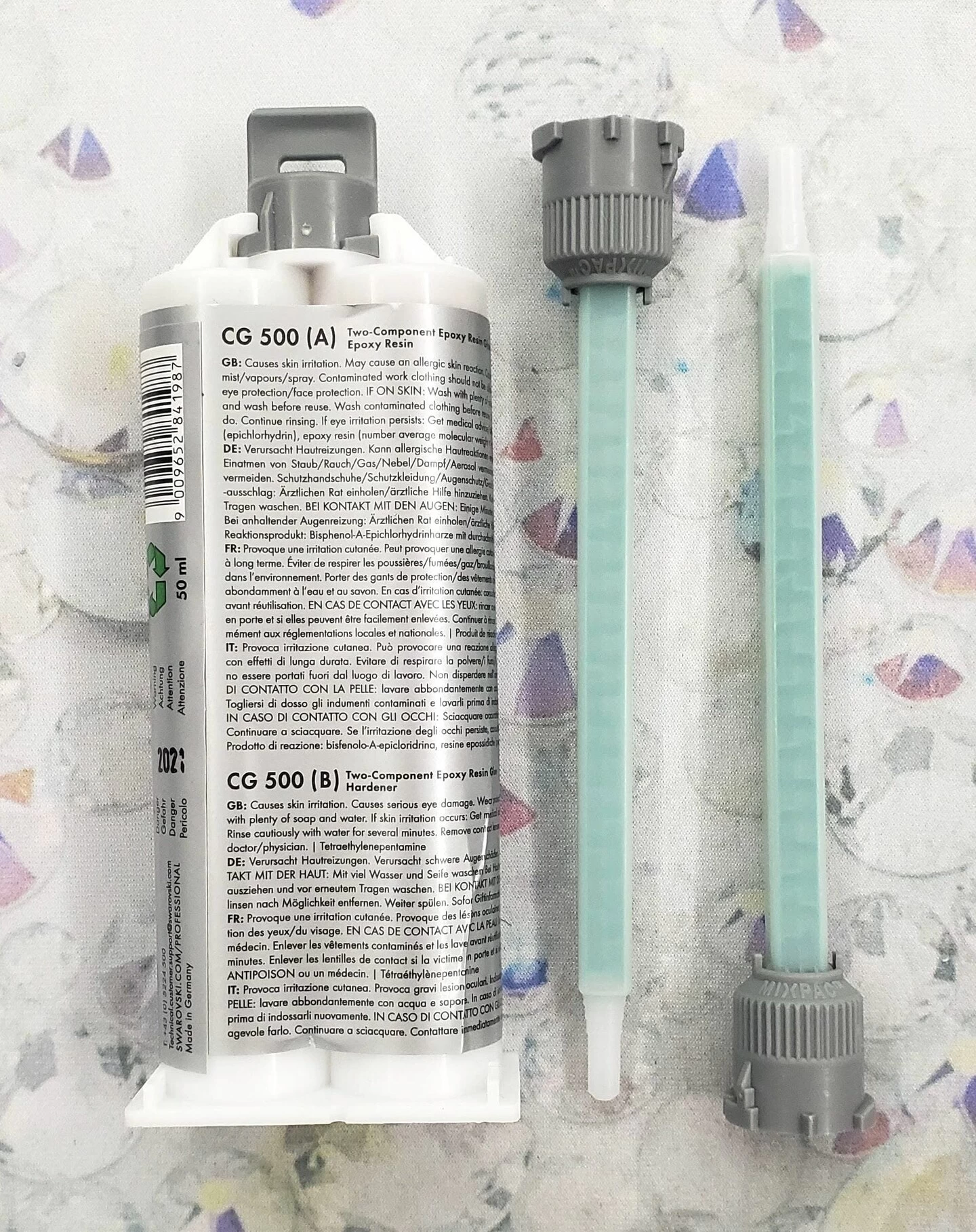 CG 500-35 Two-Component Epoxy Resin Glue. This is a two-part glue is especially well-suited for use in jewelry and accessories, electronics, and interior markets. It adheres to materials such as metals, rubbers, synthetics, and glass. It’s highly resistant to humidity, chlorine, salt, mechanical stress, and UV light. To use, mix equal parts together in a 1:1 ratio for one minute.