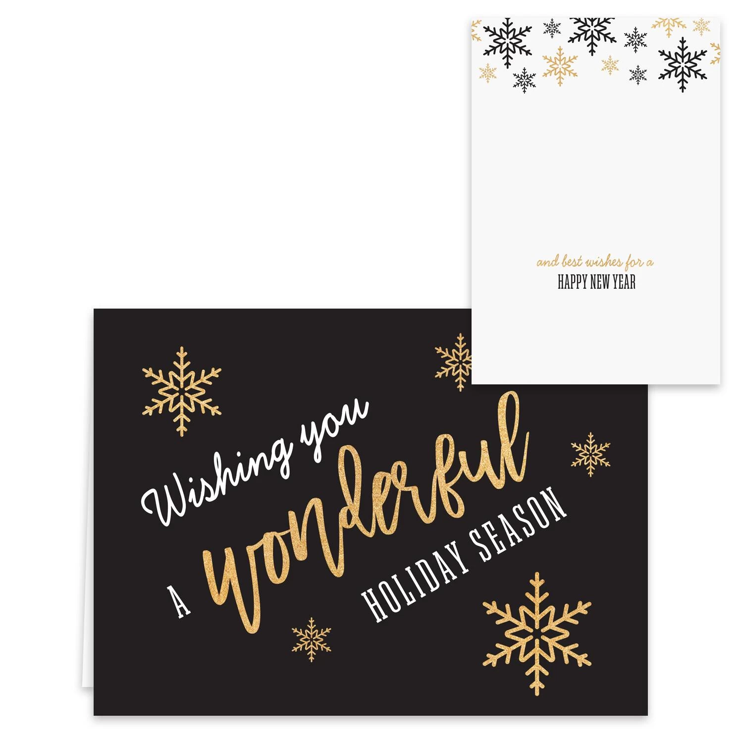Warm your loved ones’ hearts this season with these black and gold holiday-themed cards. With 6 different holiday phrases designs, you can send a unique greeting to the special ones in your life.