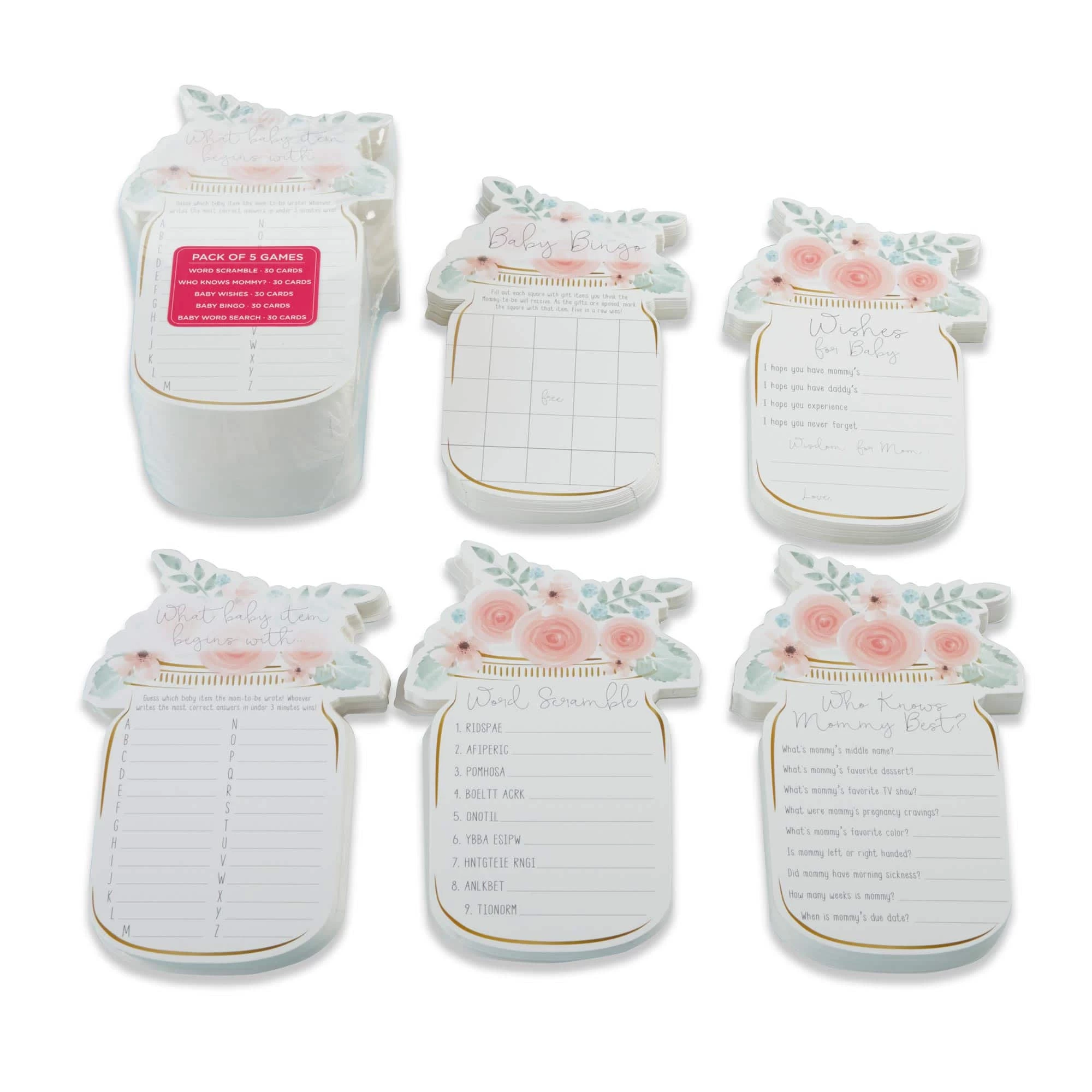 This Kate Aspen baby game set features shower-friendly activities for party guests. The games include “Wishes for the Baby”, “Who Knows Mommy”, word Scramble, and bingo. The dark gray printed text outlines the game section for guests to fill out. Appropriate for all ages, save these memory cards for a boost of confidence when you need words of advice years after the celebration ends.