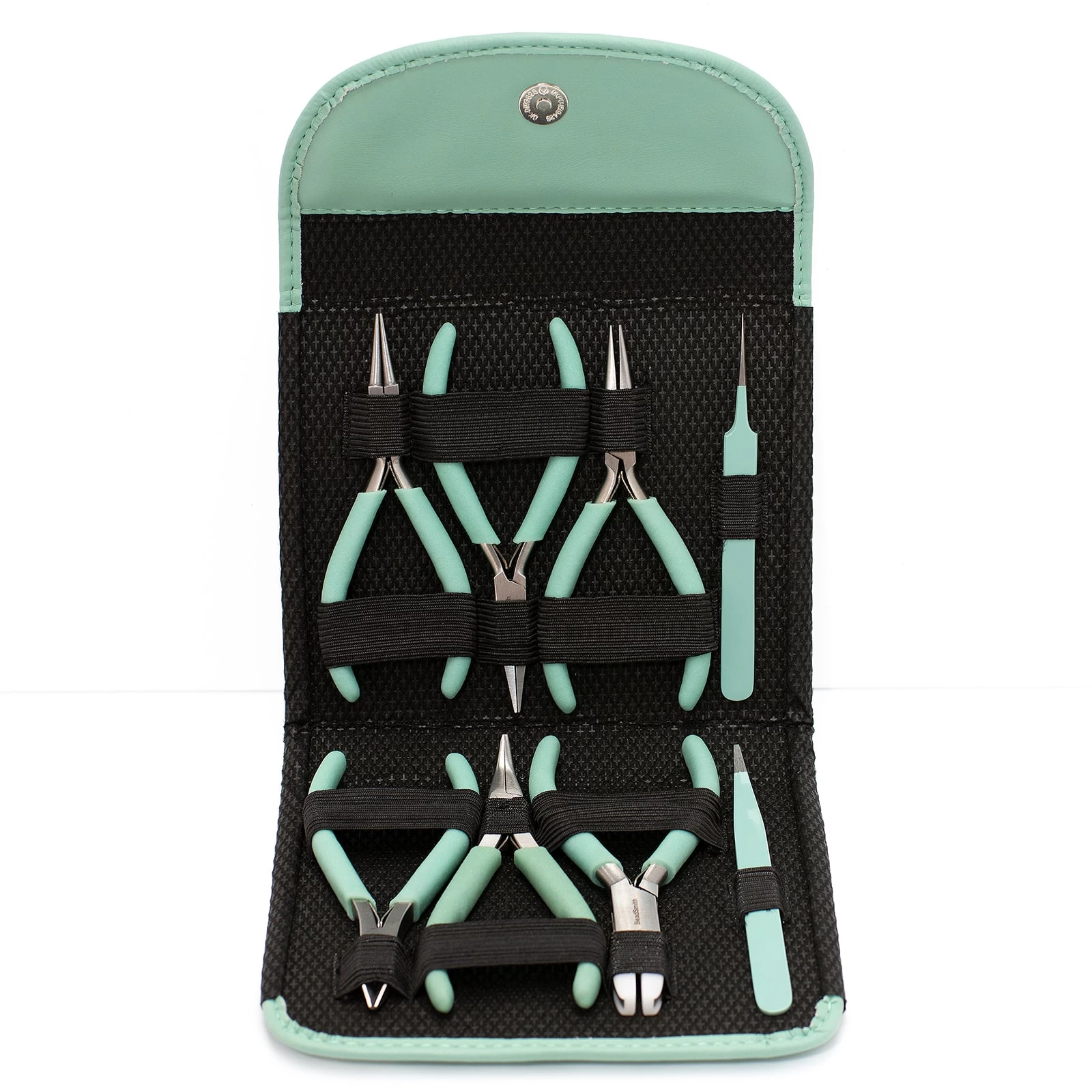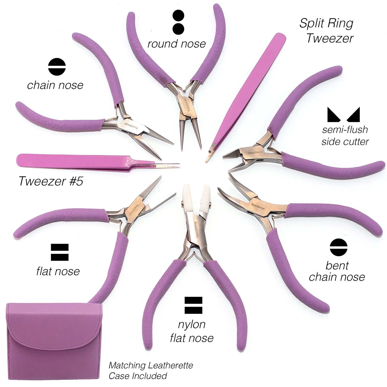 Tools in your Favorite Vibrant Colors! Features 8 fashion-color tools in a color-coordinated clutch… Perfect for the style-conscious beader! Each set contains the following tools: Chain Nose Plier; Bent Chain Nose Plier; Flat Nose Plier; Round nose , Cutter, Nylon Jaw Flat knotting Tweezer and split ring Tweezer.